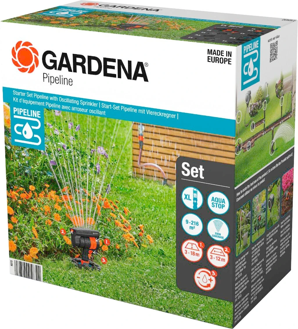 De startset kan onbeperkt met Pipeline-onderdelen worden uitgebreid. De Gardena Pipeline startset met zwenksproeier wordt in Europa vervaardigd. Water waar het nodig is. Gemakkelijke toegang tot water: aanvoerbuizen onder de grond.
