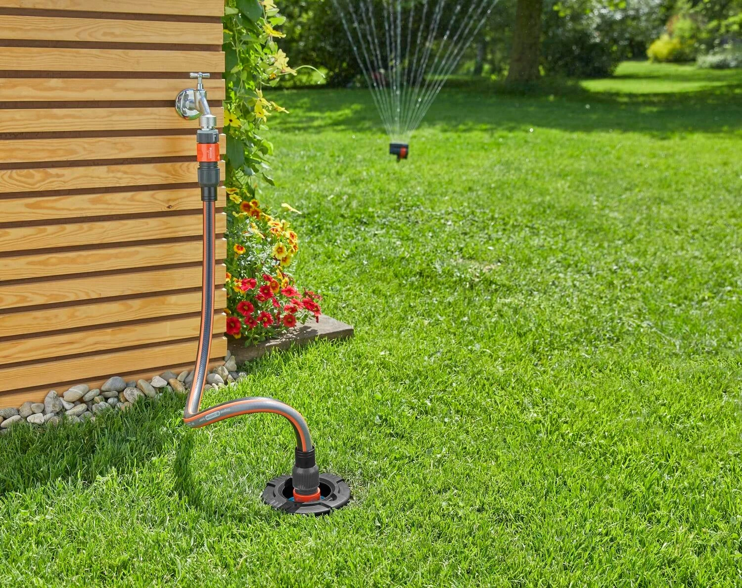 Het aansluitgarnituur functioneert als het verbindende element tussen de waterkraan en de aanvoerbuis in de grond. Met het meegeleverde T-stuk kun je de buis ook nog aftakken in een andere richting. De twee waterverdelers vormen handige watertappunten, waar je niet alleen een slang kunt aansluiten, maar ook de zwenksproeier kunt gebruiken. Water tappen is nu net zo gemakkelijk als de kraan binnenshuis opendraaien.