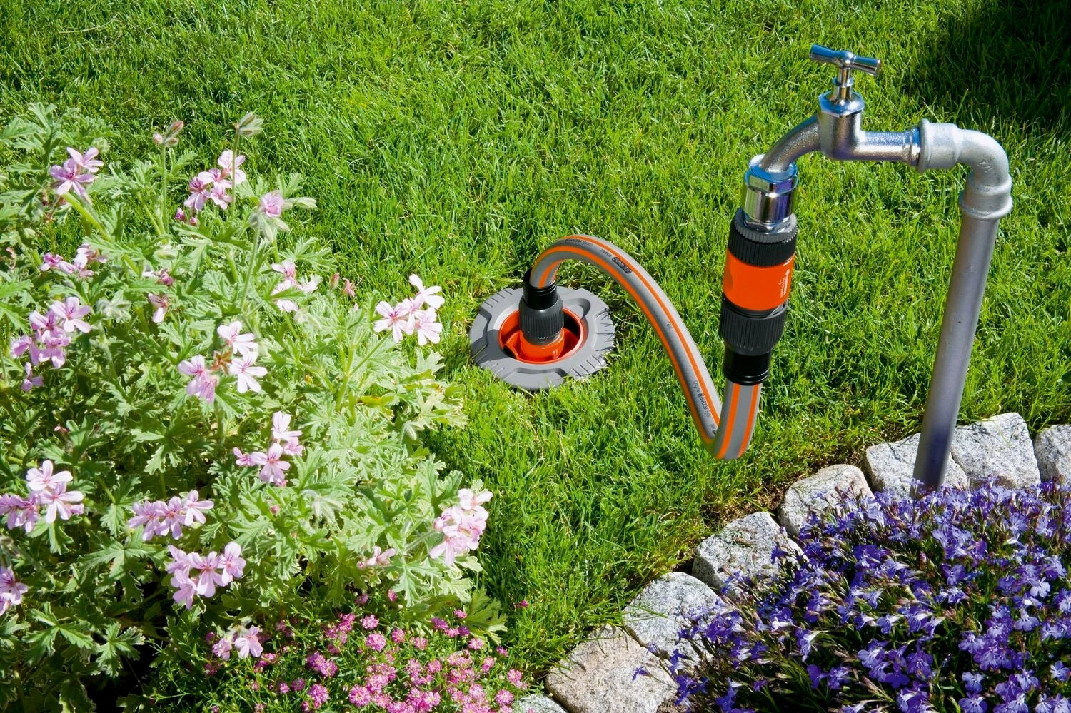 Met het Gardena Aansluitgarnituur kunt u de kraan aansluiten op het ondergrondse Gardena Sprinklersystem of de Gardena Pipeline. Er wordt een Gardena Prof-System Maxi-Flow Kraanstuk meegeleverd. Als er een beregeningsventiel of waterstopcontact wordt aangesloten, staat de slangaansluiting continu onder druk; in dat geval moet de druk in de slangaansluiting worden gestabiliseerd met het Kraanaansluitstuk. De opklapbare, bolvormige afdekking verdwijnt bij opening binnenin het aansluitgarnituur en vormt dus geen probleem bij grasmaaien. Door de brede rand kan er geen gras in de afdekking groeien. Een uitneembaar filter voorkomt vervuiling van het contact als de afdekking open is. Het Gardena Aansluitgarnituur heeft een buitendraad van 3/4 inch.