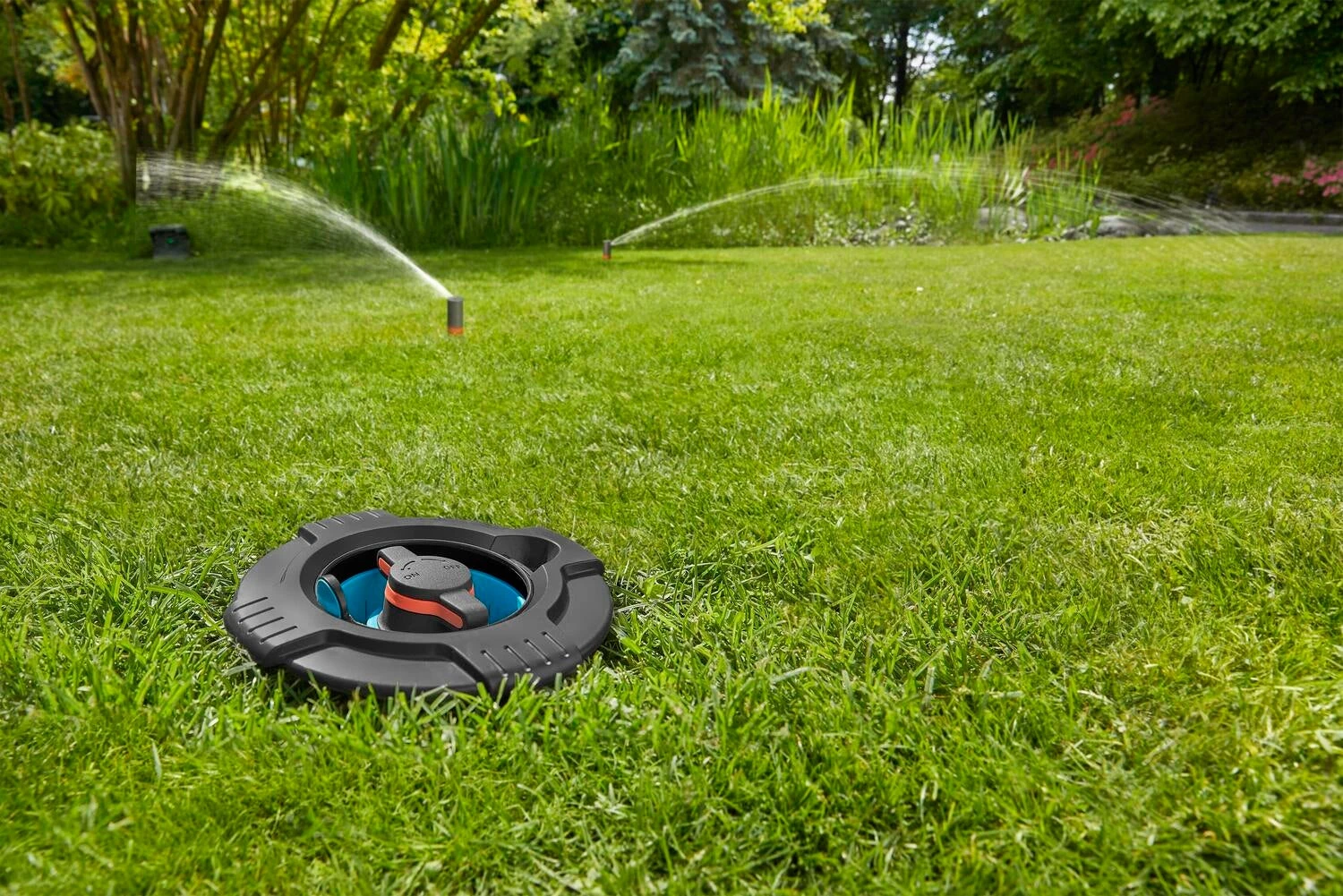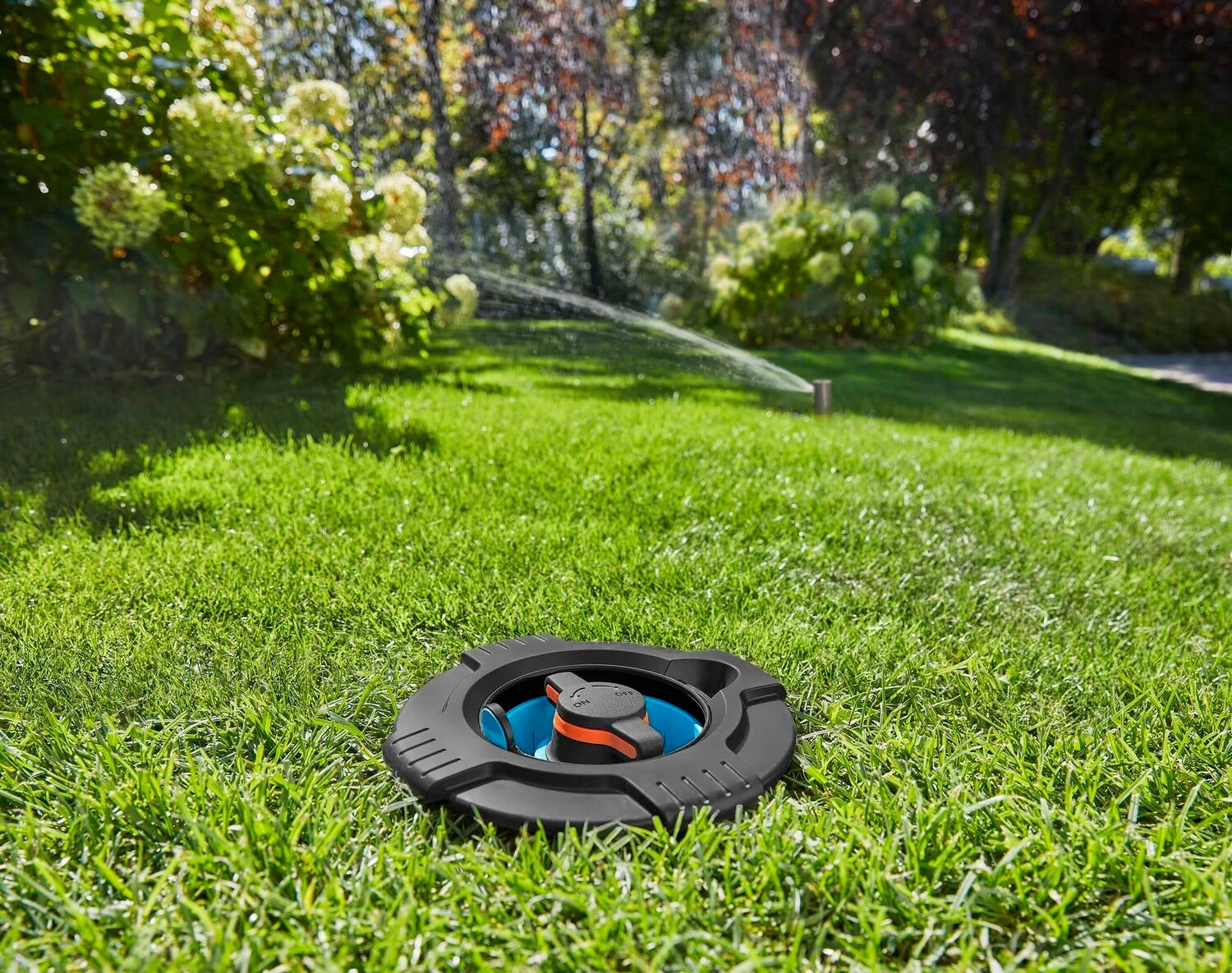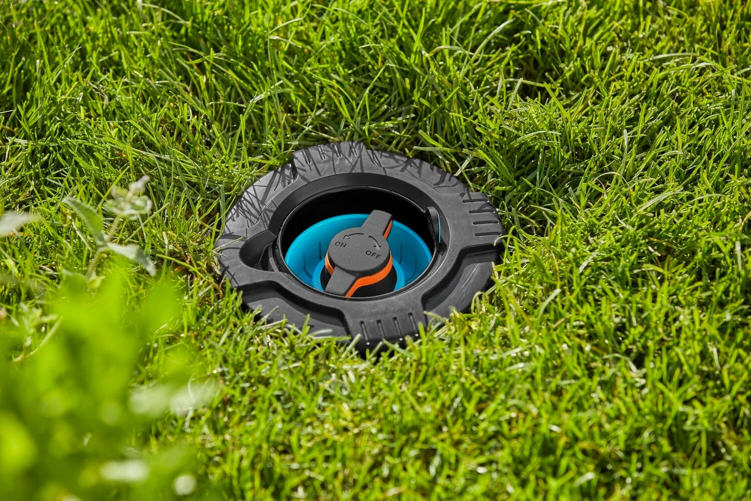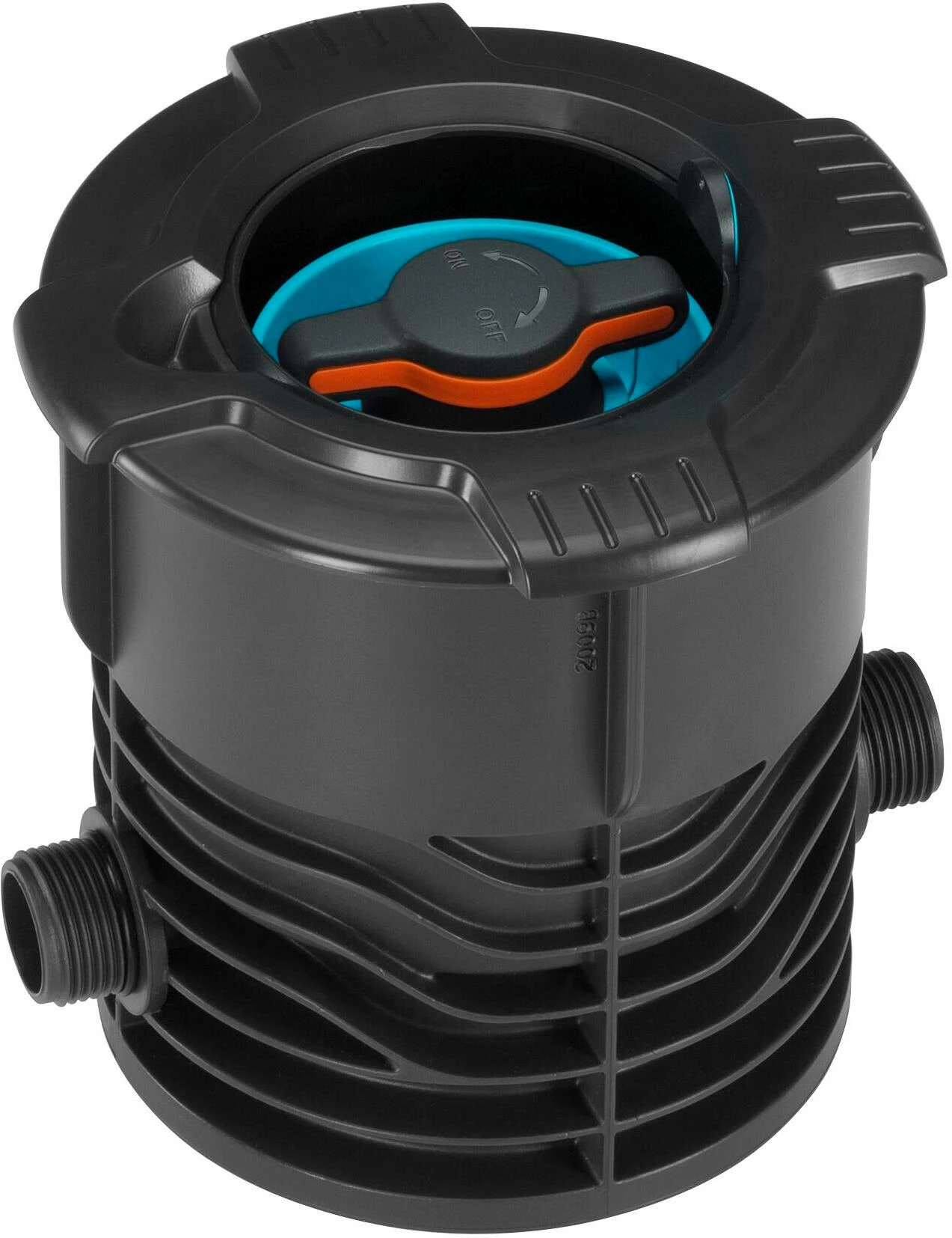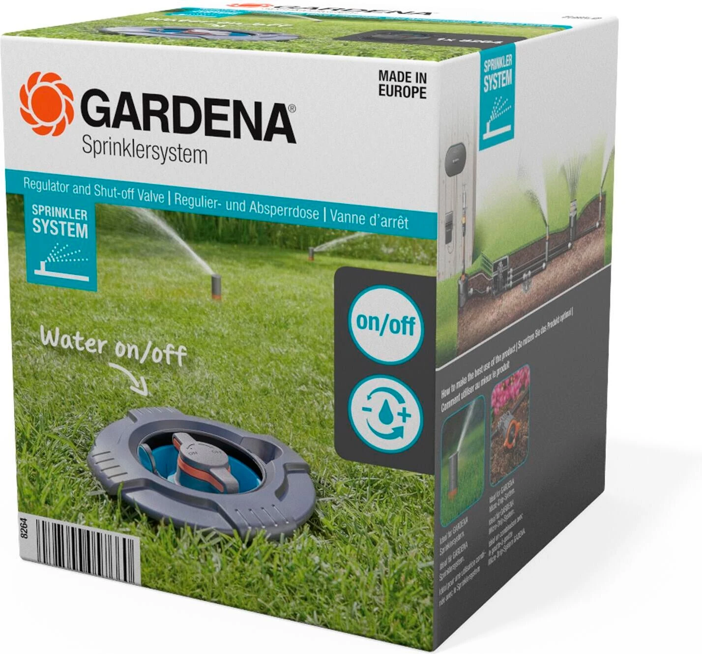 Het Gardena reguleer- en afsluitventiel – als onderdeel van het Gardena sprinklersysteem – wordt gebruikt om handmatig afzonderlijke, verzonken turbinesproeiers of hele groepen sproeiers te reguleren of af te sluiten. De watertoevoer kan traploos worden ingesteld of helemaal worden uitgeschakeld. Het bolvormige deksel verdwijnt bij opening naar binnen en vormt hierdoor geen probleem bij het maaien van het gazon. Door de brede rand kan er geen gras in het deksel groeien. Een uitneembaar filter voorkomt vervuiling van het binnenwerk als het deksel open is. Het Gardena reguleer- en afsluitventiel heeft een 3/4” buitendraad.