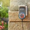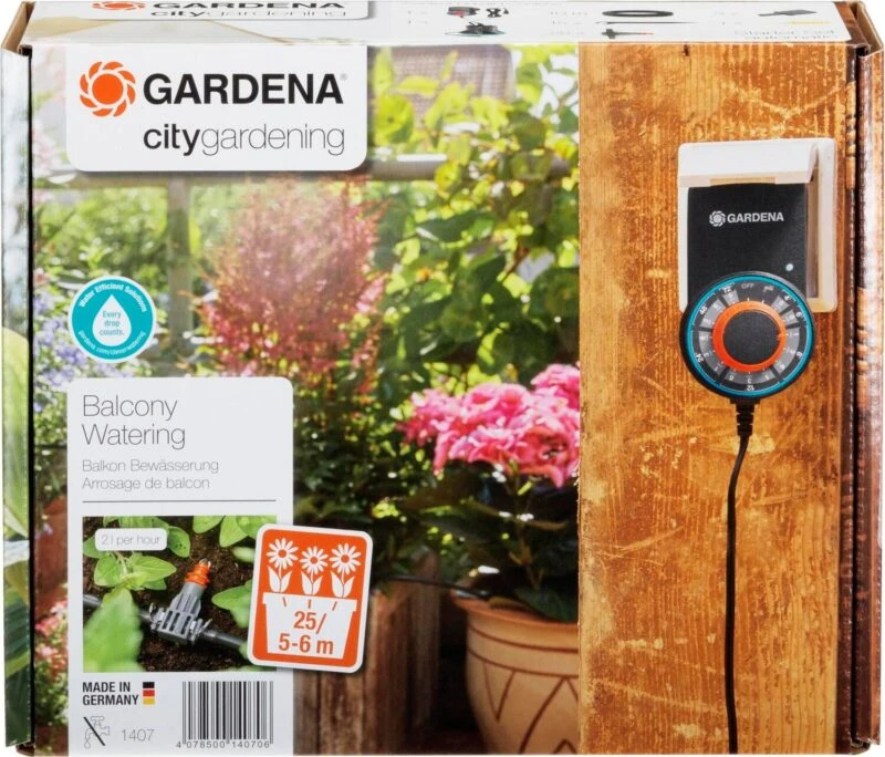De Gardena Set voor volautomatische bloembakbesproeiing kan tot maximaal zes meter aan bloembakken automatisch besproeien. Met de ingebouwde timer met 13 vaste programma’s kunnen uw bloembakken eenvoudig worden bewaterd terwijl u er niet bent. Ze zijn niet afhankelijk van de kraan en het bewateren van bloembakken kan direct worden geregeld vanuit bijvoorbeeld een regenton. Als er meer dan zes meter aan bloembakken moet worden aangesloten, kan de set worden uitgebreid. Voor waterbesparend besproeien kan de Gardena Bloembakbesproeiing worden aangesloten op de Gardena Regensensor electronic (art. nr. 1189-20) en de Bodemvochtigheidssensor (art. nr. 1188-20). De set bestaat uit een transformator met draaischakelaar voor het selecteren van het besproeiingsprogramma, een 14 V laagspanningspomp met vuilfilter, 25 seriedruppelaars (2 l/u) met einddop en reinigingsnaald, 10 m verdeelbuis 4,6 mm (3/16″) en 15 buishouders.