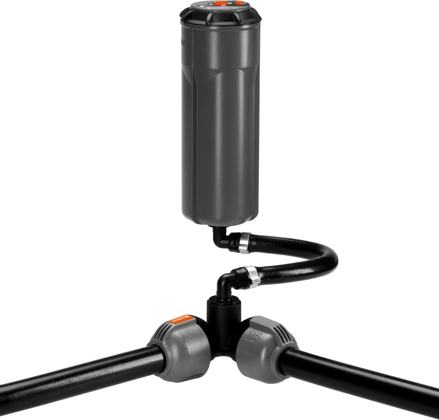 Als onderdeel van het Gardena Sprinklersystem kunnen de Verzonken sproeier S 80 en de Verzonken turbinesproeiers T 100 en T 200 met het Gardena Hoekstuk 25 mm x 1/2 inch buitendraad in hoeken worden geplaatst. Door de gepatenteerde ‘Quick & Easy’-aansluittechnologie kunnen leidingen zonder gereedschap worden gemonteerd en gedemonteerd door de schroefaansluiting 140° te draaien. Voor een waterdichte, veilige werking is de schroefdraadaansluiting van het hoekstuk zelfafdichtend.