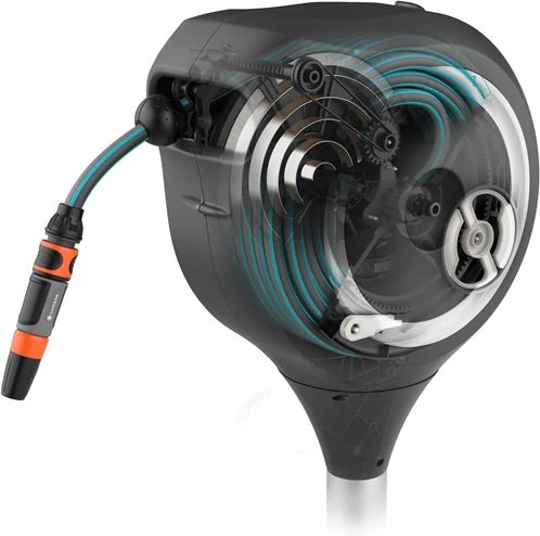 Dankzij de ingebouwde korte vergrendelingspunten kun je de slang moeiteloos hanteren en automatisch op de gewenste lengte afrollen. Door het innovatieve ontwerp kan de slangenbox 360 graden worden gedraaid en kun je elke hoek van de tuin bereiken. De slangenbox volgt jouw bewegingen tijdens het bewateren en voorkomt dat de waterslang knikt of in de war raakt. Bovendien maakt deze slangenbox het lastige oprollen overbodig, hoeft je niet te bukken en blijven je handen schoon en droog: door kort aan de niet gerolde slang te trekken wordt de geïntegreerde veer geactiveerd, die de slang volledig automatisch en betrouwbaar oprolt.