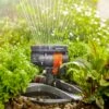 De zwenksproeier is uitgerust met een ronde basis waardoor hij stabiel op de grond staat en daardoor bijzonder geschikt om bijv. in het midden van een groentebed te plaatsen en de plantjes rondom water te geven. De bewatering van de AquaZoom compact beslaat een royale oppervlakte van 9 tot 216 m². Met de schuifregelaar stelt u flexibel zowel het bereik (3–18 meter) als de sproeibreedte (3–12 meter) eenvoudig in. Het gebruik van hoogwaardige materialen resulteert in een fabrieksgarantie van 5 jaar. Verder heeft u de zekerheid dat noch vorst of UV straling uw GARDENA sproeier beschadigen.